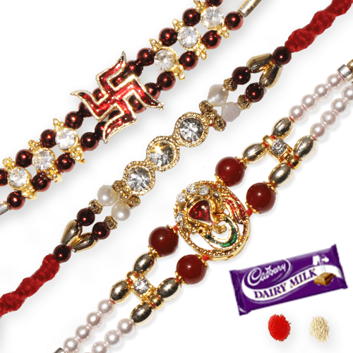 • This set contains 3 exclusive Rakhis and 1 delicious Dairy Milk Chocolate