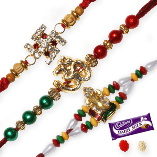 • This set contains 3 Rakhis and 1 delicious Dairy Milk Chocolate