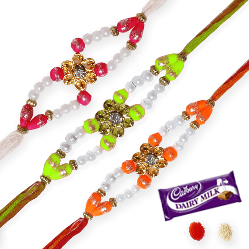 • This set contains 3 Elegant Rakhis and 1 bar of delicious Dairy Milk Chocolate.