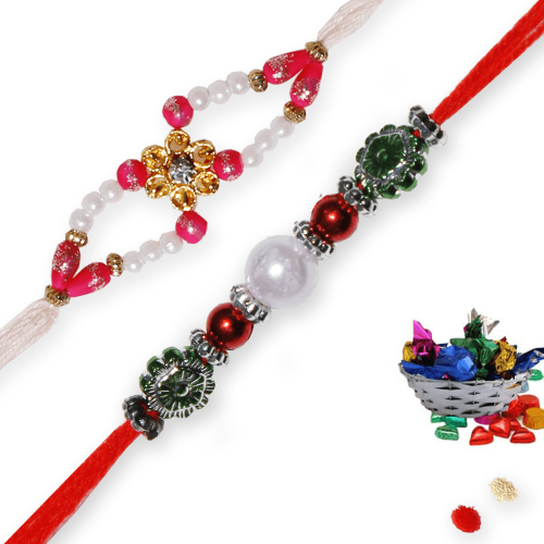 • This set contains 2 Rakhis and a beautiful chocolate basket containing & 8 pices of delicious chocolates in different flavours