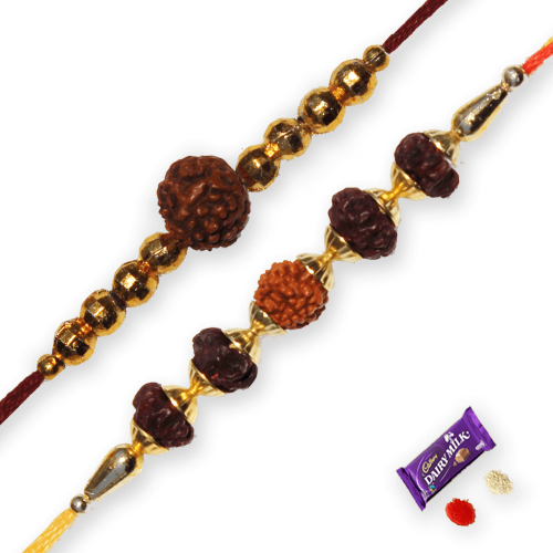 • This set contains 2 beautiful Rudraksh Rakhis and 1 bar of delicious Dairy milk chocolate