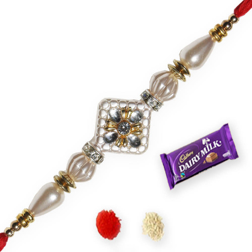 • An Elegant Cream fancy Rakhi with beads for your special brother. • This pack contains 1 Rakhi and 1 Dairy Milk Chocolate • A Perfect Rakhi for your lovely Brother. • Rakhi will be delivered with FREE Roli and Chawal. • FREE delivery to India.