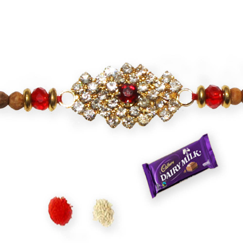• An Elegant Floral Shape colorful Rakhi with American Diamond . • This Rakhi comes with 1 bar of Dairy milk chocolate • May the thread of love bring happiness for you and your brother. • Rakhi will be delivered with FREE Roli and Chawal. • FREE delivery to India.