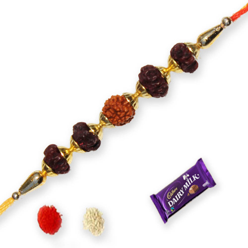 • An Exclusive Rudraksh Rakhi with beads comes with 1 bar of Dairy milk chocolate. • A precious rakhi which your brother would love to treasure forever. • May the thread of love bring happiness for you and your brother. • Rakhi will be delivered with FREE Roli and Chawal. • FREE delivery to India.