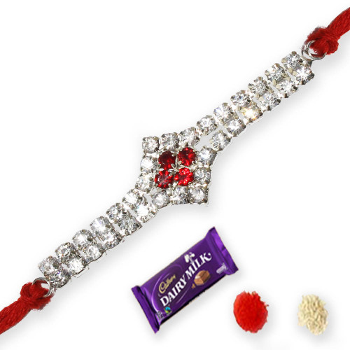 • Send this Stunning American Diamond Rakhi with Red Diamonds, so that your brother can shine like the diamonds embedded in Rakhi and one bar of Dairy milk chocolate.