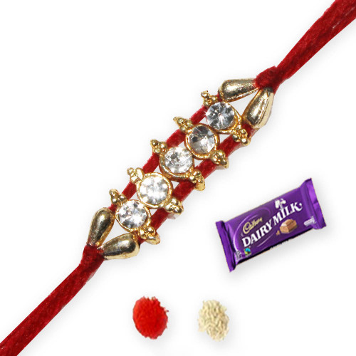 - A Graceful 5 American Diamond Rakhi Thread for your lovely brother with 1 bar of Dairy milk chocolate.