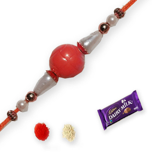 • A Graceful Orange Stone Rakhi for your lovely brother with white beads and orange thread. • A Perfect Rakhi for your lovely Brother comes with one bar of Dairy milk chocolate. • May the thread of love bring happiness for you and your brother. • Rakhi will be delivered with FREE Roli and Chawal. • FREE delivery to India.