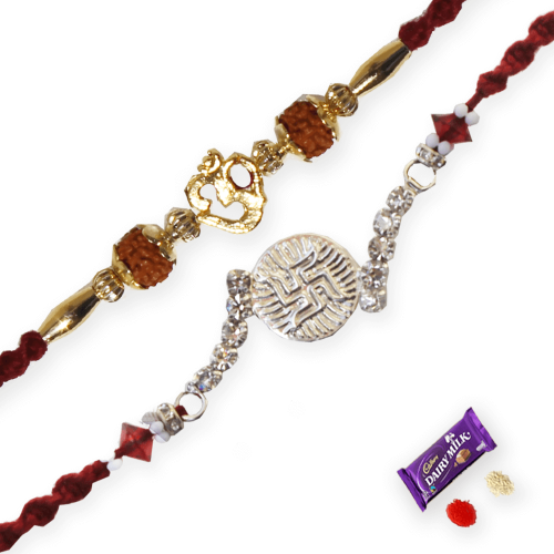 • This set contains 2 elegant Rakhis and 1 bar of Dairy milk chocolate: 1. Stylish Swastik Rakhi 2. Elegant Om Rakhi