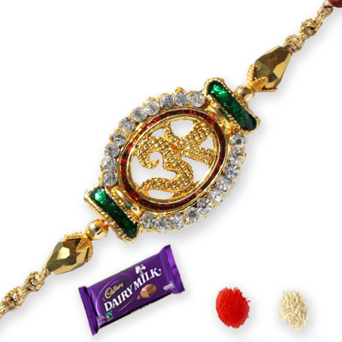 • Send this OM Rakhi which has beautifully OM embeded in Rakhi and Diamonds surrounding OM with one bar of Dairy milk chocolate