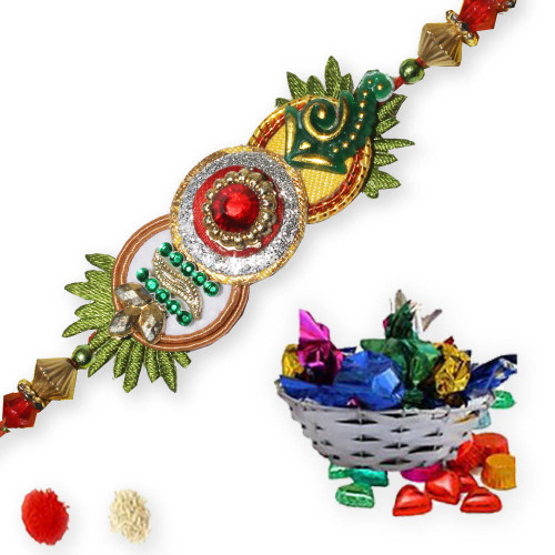 • This Rakhi set contains 1 Fancy Zardosi Rakhi with 8 delicious treat of Chocolates including attractive silver basket.