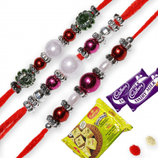 • This set contains 3 Elegant Rakhis and delicious 250gm of Haldiram Soan Papdi • Send this speci..