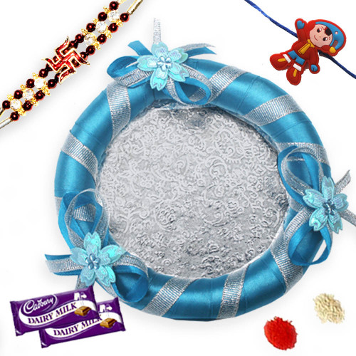 - 2 Elegant Rakhis specially crafted for your brothers with 2 delicious Dairy Milk Chocolates.