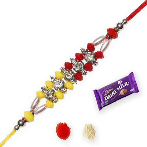 • An Elegant Red Yellow Diamond Rakhi for your dear brother having beautiful shape rakhi thread with one bar of Dairy Milk chocolate.