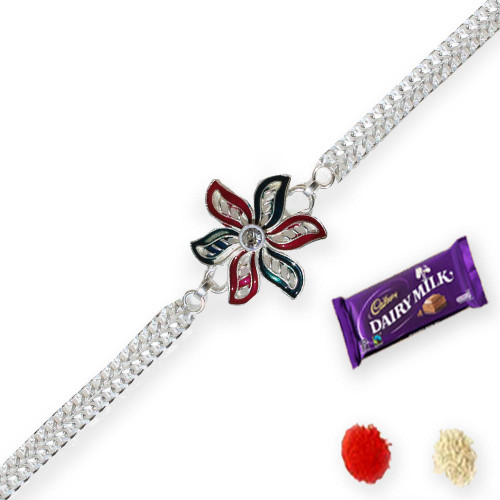 A young and modern type Braclet rakhi in Silver plated for your lovely brother. This Rakhi comes with 1 bar of Dairy milk chocolate.