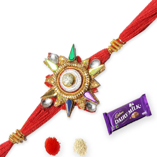 Star Rakhi includes a design inside. This Rakhi comes with 1 bar of Dairy Milk chocolate