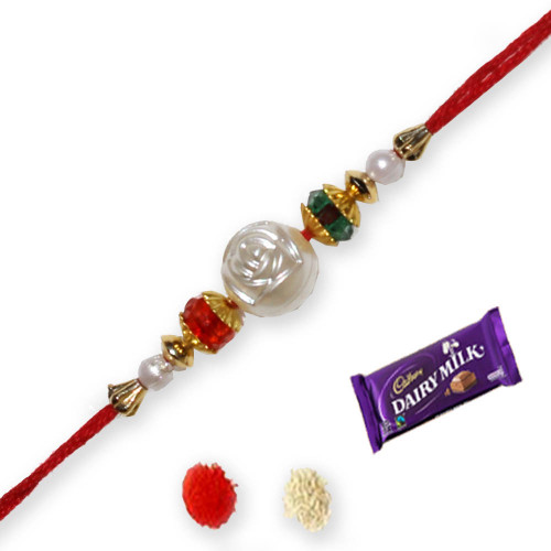 - A stylish floral shape Rakhi with with colorful beads for your dear brother. This pack also contains delicious Dairy milk chocolate.