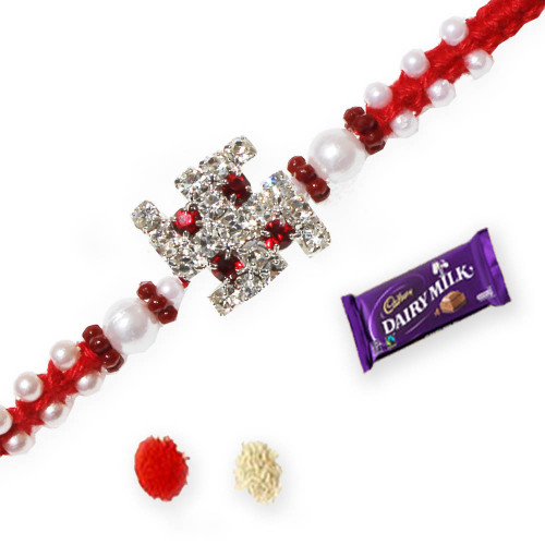 • An Attractive Swastik Embedded Rakhi for your lovely brother comes with 1 bar of Dairy Milk chocolate. • May the thread of love bring happiness for you and your brother. • Celebrate the joyous occasion of rakhi by sending this special Rakhi to your loving brother. • Rakhi will be delivered with FREE Roli and Chawal. • FREE delivery to India.